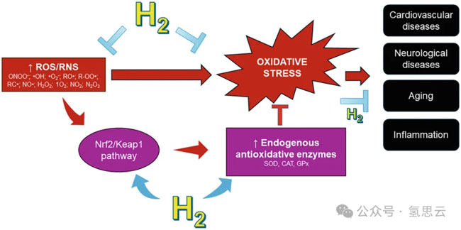 近几十年来,氢气(H₂)作为一种可减轻心血管疾病(CVD)中氧化应激的治疗剂,已受到广泛关注。氢气是一氧化碳(CO)的上游信号分子,可与氧化态铁卟啉(尤其是血红素)相互作用,在缺血后心脏顿抑、心肌致死性损伤及恶性快速性心律失常发生等多种病理状态下减轻氧化应激。然而,其在心血管疾病发病机制中的作用,以及在心血管疾病防护中的具体机制尚未完全明确,仍需进一步阐明。 本文是2025年欧洲氢医学研究会会长Jan等撰写的一个书稿章节。书稿文献的特点是有更强的确定性和系统性,内容有利于读者客观准确了解这个领域。 近年来,氢气疗法因其在多种健康状况(尤其是临床前模型)中展现出的多样治疗效果而备受关注。这种创新性疗法已被证实具有减轻氧化应激、调节血压、促进损伤修复、改善线粒体功能及重塑代谢的潜力[1,2,3]。这些研究结果凸显了在临床环境中进一步探索氢气治疗潜力的必要性。 心血管疾病是一类由多种危险因素引发的复杂疾病,这些因素会损伤心肌细胞和血管,最终导致器官功能障碍。在这一背景下,氢气疗法已成为一种极具前景的干预手段[3],尤其在心肌梗死后恢复过程中的两个关键环节——心肌重构与纤维化的调控方面。 研究表明,氢气能显著减轻与心力衰竭密切相关的纤维化和细胞凋亡过程。这提示,以心脏重构为靶点的创新性治疗策略或可提高缺血性疾病患者的生存率。此外,过氧化氢(H₂O₂)等活性氧(ROS)通过影响血管舒缩功能,在血管疾病的发病机制中发挥关键作用[4]。除高血压、糖尿病等传统心血管疾病危险因素外,类风湿关节炎等疾病也会独立促进动脉粥样硬化的发生。炎症与氧化应激之间的复杂相互作用在类风湿关节炎和冠状动脉疾病(CAD)中尤为显著——在这两种疾病中,自由基和促炎细胞因子会加剧二者的关联[5]。氧化应激增强会导致血管细胞黏附分子1(VCAM-1)、细胞间黏附分子1(ICAM-1)等黏附分子的表达上调,进而加重血管功能障碍[6]。 自2007年首次报道氢气的有益作用以来[7],已有超过2000项研究发表,探索其在多种疾病模型中的作用。早期研究主要聚焦于氢气的自由基清除特性,而如今人们日益认识到,其治疗效果可能源于对多条分子通路的调控,而非单纯中和自由基[8]。因此,通过改善内皮功能、减轻氧化应激相关损伤,氢气疗法为心血管疾病的治疗提供了极具吸引力的方向。 氢气的特性 氢气是宇宙中最简单且含量最丰富的分子,由两个氢原子通过化学键结合而成。氢气分子中的每个氢原子均含有1个质子和1个电子,二者通过共价键共享电子,形成稳定的双原子分子。该分子无色、无味、无臭,在正常条件下无法被人体感官感知。氢气具有高度易燃性,与氧气反应会发生爆炸并生成水,同时释放大量能量,因此是一种潜在的清洁燃料来源。其密度低、分子质量最小,在地质时间尺度上可逸出地球大气层。由于分子体积小,氢气能快速穿透多种材料,这一点在其储存和运输过程中需重点考虑[9,10]。 化学性质方面,氢气在室温下相对稳定,但在高温或催化剂存在的条件下会变得活跃,可在多种化学反应中作为还原剂。氢气在多个科学领域均发挥关键作用,例如在生物化学中,它参与某些微生物的代谢过程[11]。 氢气的作用机制及其潜在靶点 在血红素(一种氧化态卟啉)的介导下,氢气可与羟基自由基(·OH)发生催化反应。通过这一相互作用,氢气能修复多种氧化态卟啉,反应过程如下: 这一过程体现了氢气作为生物传感器的作用,以及其将有害自由基转化为无害物质的能力,从而改善细胞功能并防止氧化损伤[12]。 综上: - 氢气的作用靶点是氧化态铁卟啉; - 铁卟啉是与氢气相关的氧化还原生物传感器; - 氢气是一氧化碳的上游信号分子。 要促进氢气与羟基自由基的反应,需借助卟啉氧化态(血红素)的催化作用[12]。氢气能够将多种类型的卟啉从氧化态修复为还原态。 近期研究强调,血红素是氢气的关键作用靶点,这一发现解决了在均相水溶液与活细胞中观察到的反应速率差异问题。铁卟啉的氧化态可作为氢气的生物传感器,促进反应快速发生,将有害自由基转化为无害的水[13]。 在多种病理状态下,氢气可通过减轻不同器官的氧化应激发挥多种有益作用,同时还具有抗炎、抗凋亡及促进能量代谢的特性。氢气的这些多样功能,可能源于其与体内分布的多种卟啉的相互作用。与硫化氢(H₂S)等其他医用气体(高浓度时具有毒性)不同,即使在较高浓度下,氢气也无毒性。Tomofuji等人[14]的研究显示,饮用富氢水(H₂浓度为0.19 mM)一年后,氢气组与对照组的发病率和死亡率无显著差异,且氢气组的牙周损伤程度有所减轻。临床试验已证实氢气的安全性,研究显示其疗效明确且无不良反应[15,16]。此外,氢气吸入已在Ⅰ期临床试验中被证实安全[17]。 氢气在生物体内的作用 凭借独特的理化性质,氢气与传统抗氧化剂和抗炎药物有所不同。生物医学研究表明,氢气在减轻活性氧过度产生相关损害方面具有巨大潜力,例如可改善因钠钾ATP酶功能降低和炎症导致的缺血后恶性心律失常诱发及功能恢复障碍[18,19]。作为小分子物质,氢气能在体内自由扩散,且不影响信号活性物质[20]。氢气性质稳定,可选择性清除细胞毒性最强的羟基自由基和亚硝基自由基。它作为一种气体信号调节剂,能有效减轻氧化应激和炎症反应,已在动物和人类的170