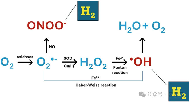 图35.2 超氧阴离子的产生与调控 在免疫应答和体力活动过程中,氧气摄入增加会导致超氧阴离子产生增多。超氧阴离子是重要的信号分子,其浓度受到严格调控:超氧化物歧化酶(SOD)可将超氧阴离子转化为过氧化氢(H₂O₂);过氧化氢在被过氧化氢酶(CAT)转化为水和氧气前,可进一步调控基因表达并诱导细胞发生有益改变。若超氧阴离子或过氧化氢水平超过机体调控能力,则会引发氧化应激;其水平过高还可通过哈伯-韦斯反应(Haber–Weiss reaction)和芬顿反应(Fenton reaction)生成具有毒性的羟基自由基(·OH)。过氧亚硝酸盐(ONOO⁻)和羟基自由基可氧化细胞内生物分子,导致疾病发生及组织损伤。尽管抗氧化剂可降低活性氧浓度,但氢气因其相对惰性,被认为是对过氧亚硝酸盐和羟基自由基具有选择性的清除剂(改编自Slezák等人[3])。 活性分子的双重作用 活性分子的来源、浓度、作用部位及持续时间不同,其作用也会呈现有害或有益的双重性。正常生理状态下,线粒体、细胞核膜、质膜及内质网会持续产生超氧阴离子: - 免疫应答过程中,超氧阴离子产生增加,以清除病原体并促进炎症细胞因子表达[34]; - 体力活动时,氧气摄入增多会导致超氧阴离子生成增加,此时它作为重要信号分子,可激活转录因子并提升机体运动能力。 通过严格调控产生与清除过程,超氧阴离子浓度可维持在较窄的生理范围内[35]。 超氧化物歧化酶(SOD)将超氧阴离子转化为过氧化氢(H₂O₂);过氧化氢在被过氧化氢酶(CAT)分解前,可调控基因表达并诱导细胞发生正向改变[33]。若超氧阴离子或过氧化氢过量,则会引发氧化应激,并可能通过哈伯-韦斯反应和芬顿反应增加毒性羟基自由基的产生(铁与超氧阴离子还可通过循环反应进一步促进羟基自由基生成)。一氧化氮自由基(NO·)对内皮功能、基因表达及细胞增殖至关重要,但过量时(尤其诱导型一氧化氮合酶(iNOS)过度激活时)会形成有害的过氧亚硝酸盐(ONOO⁻)。过氧亚硝酸盐是强氧化剂,可氧化蛋白质、脂质及DNA,且无需通过芬顿反应即可独立生成毒性羟基自由基[36]。 在病理状态或高强度运动下,活性氧大量产生会耗尽机体抗氧化防御系统,导致氧化应激及毒性损伤[34]。尽管多种抗氧化剂可降低活性氧水平,但氢气可选择性清除过氧亚硝酸盐(ONOO⁻)和羟基自由基(·OH)这两种强氧化性自由基,且不干扰活性氧的信号传导功能[3]。活性氧与抗氧化剂的失衡与多种疾病相关,包括心血管疾病、衰老及认知功能下降等。自由基快速大量产生会突破内源性抗氧化系统的防御能力,损伤脂质、蛋白质、DNA及RNA,导致细胞退化。尽管在人类医学中,抗氧化剂的应用未始终达到预期效果,但氢气凭借独特特性在减轻氧化应激方面具有优势——它可选择性清除羟基自由基,同时保留正常细胞信号传导所需的活性氧[3]。 临床应用 目前研究日益聚焦于氢气对自由基相关疾病的作用,如缺血再灌注(I/R)损伤、心肌梗死或脑梗死、心脏移植及放射性心脏病等。16年前,研究首次报道了氢气在氧化应激相关功能紊乱中的应用,且后续实验研究与临床研究均显示出良好前景[7]。由于氢气可选择性靶向羟基自由基和亚硝基自由基这两种强毒性自由基,其在氧化应激相关心血管疾病的预防和治疗中具有潜在价值。 氧化应激和炎症应激是心肌缺血再灌注损伤的关键致病因素:心肌细胞需大量ATP供能,因此含有丰富线粒体;而线粒体中富含活性中间产物及促凋亡信号,在缺血再灌注损伤中发挥重要作用。应激诱导的线粒体通透性转换孔(mPTP)开放会导致活性氧产生增加,进而引发组织损伤。缺血再灌注过程中,活性氧、蛋白酶及生长因子积累会导致成纤维细胞增殖、胶原沉积、纤维化及组织破坏,而炎症反应会进一步加剧上述损伤[37]。研究表明,氢气可用于治疗多种以氧化应激为病理基础的疾病:一项临床试验显示,在心脏骤停后综合征(Post-Cardiac Arrest Syndrome)患者中,与对照组相比,吸入2%氢气联合氧气治疗的患者生存率及神经功能预后均显著改善[38]。 氢气疗法的疗效在心脏骤停后的恢复过程中得到了体现:临床试验表明,与标准疗法相比,吸入氢气可显著提高患者生存率并改善神经功能预后[38]。长期饮用富氢水可改善轻度认知障碍患者的认知功能,提示氢气在神经退行性疾病(如阿尔茨海默病)的治疗中可能具有潜在益处;且氢气可通过血脑屏障,进一步提升了其在神经退行性疾病治疗中的应用潜力[39,40]。 初步研究表明,吸入氢气可通过调控免疫应答,增强免疫治疗疗效并改善晚期癌症患者的生活质量[24];针对晚期癌症的氢气疗法研究显示,其在改善患者预后及生活质量的同时,还可减轻化疗、放疗等传统治疗的不良反应[41]。目前针对代谢综合征的研究正聚焦于氢气对体重管理及代谢健康的影响,有望为这一日益严峻的公共卫生问题提供新的治疗方向[42]。 氢气为多个医学领域中氧化应激相关疾病的治疗提供了突破性思路,其多样的作用表明,它有望成为一种安全有效的治疗选择[43]。 氢气对信号通路的调控 氢气可调控特定组织中的激素及细胞因子水平,进而影响多条信号通路,发挥有益作用。例如,氢气可促进脑保护相关激素——饥饿素(ghrelin)的表达[44]。近期研究阐明了氢气通过调控脂质过氧化物(LPOs)发挥多种功能的通路:通过降低脂质过氧化物水平,氢气可影响炎症及细胞存活相关的关键信